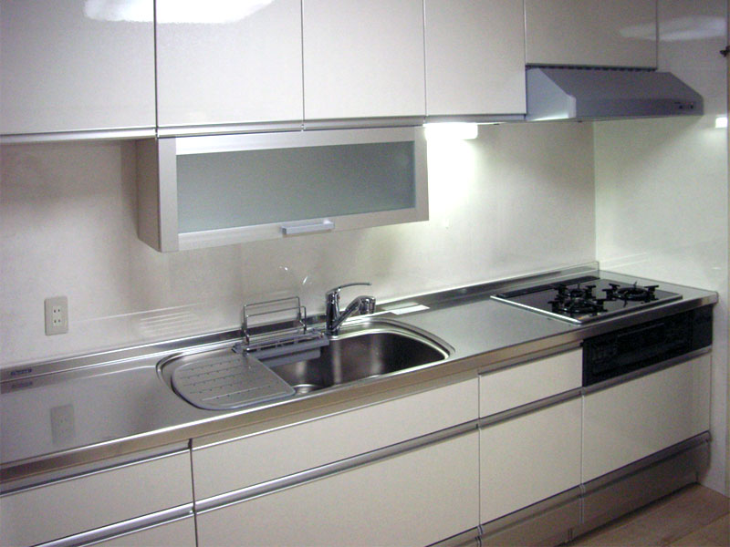 コンロの天板はガラストップにして掃除がしやすく、換気扇は油汚れが付きにくく、掃除もしやすく煙の吸い込みのいいものを採用。工期2日。
